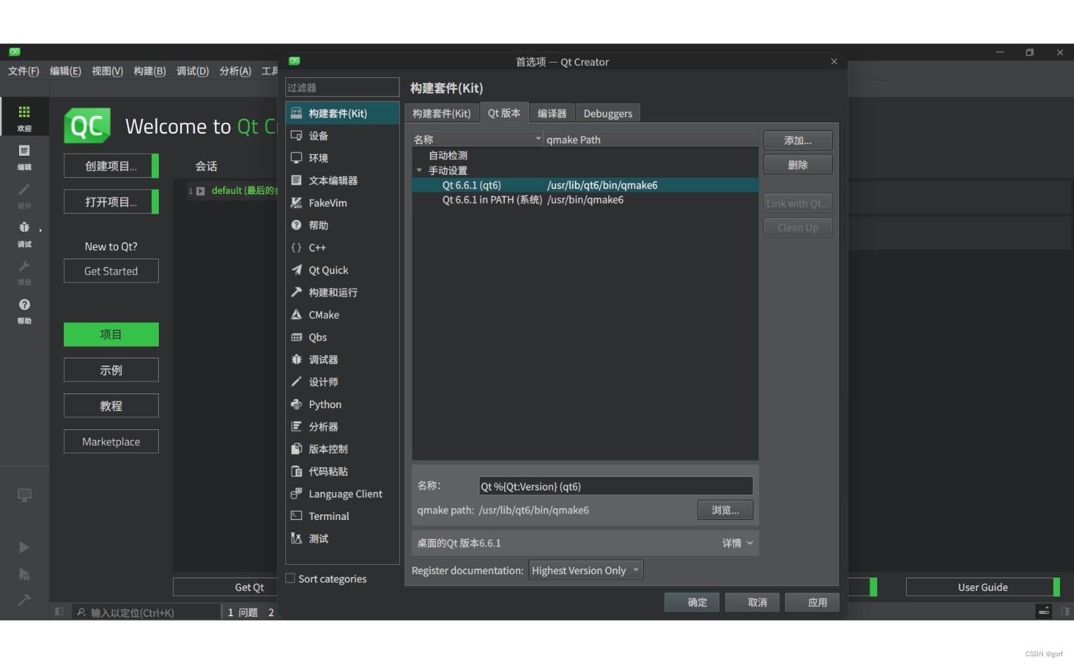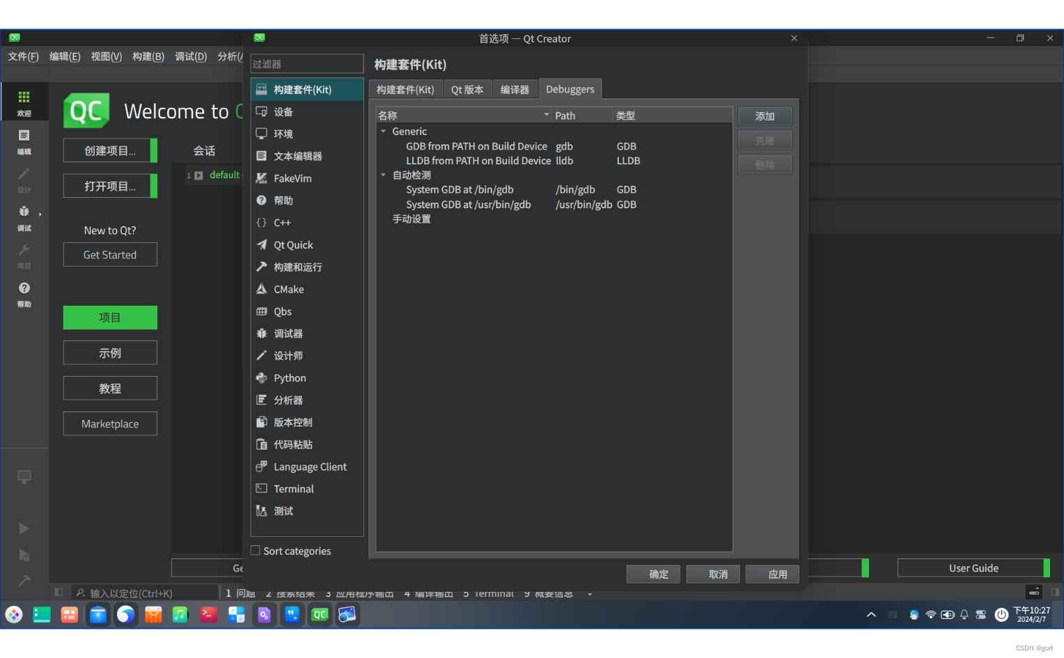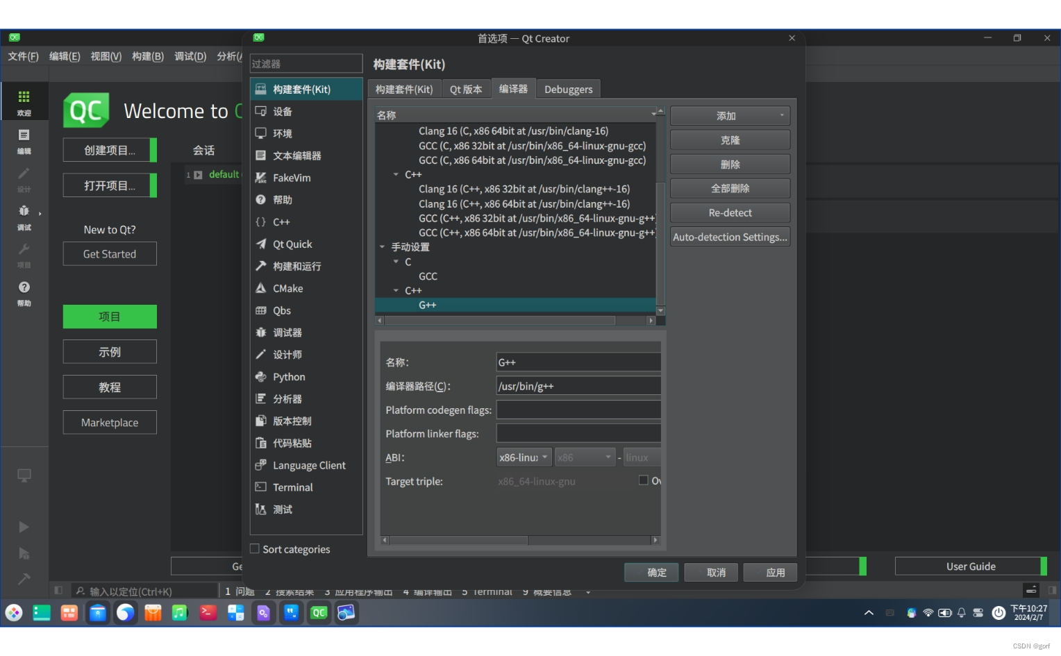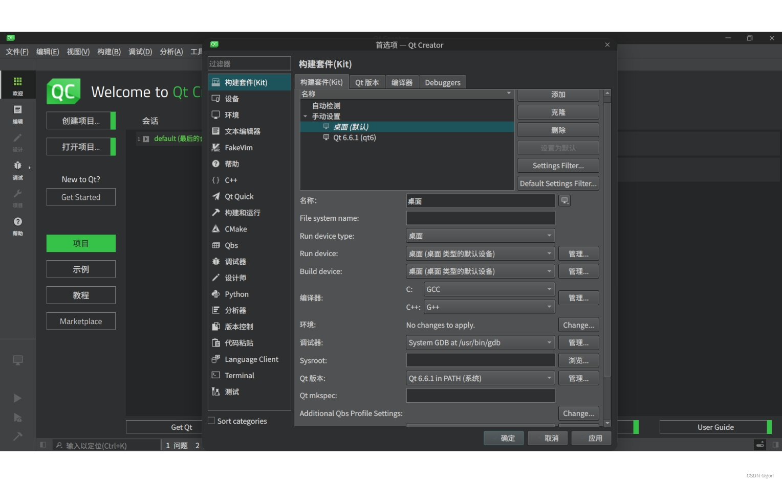 实际上,deepin v23 beta3默认上述步骤中只有第(4)步qtcreator、第(6)步g++两步未安装。安装好上述两步后,最好是自己手动配置第(8)步。qtcreator的用语是为程序配置构建套件,所谓配置构建套件具体就是配置qt版本、编译器、调试器三个组件。