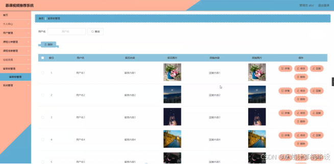 管理员点击留言板管理。在留言板页面输入用户名进行查询或删除留言板列表,并根据需要对留言板详情信息进行详情、修改、回复或删除操作;如图5-11所示: