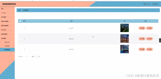 管理员点击系统管理。在轮播图管理页面可以对索引、名称、值进行详情、修改操作;并根据需要对网站公告、在线客服进行相应操作;如图5-12所示: