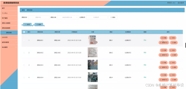 课程信息管理:管理员可以添加、修改、删除课程信息,包括课程名称、分类、开课时间、课时、任课教师、视频链接等。