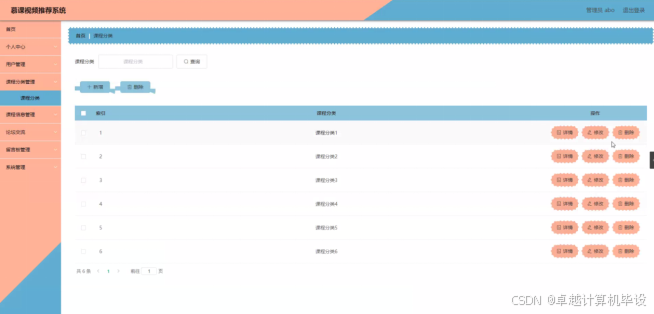 管理员点击课程分类管理。在课程分类页面输入课程分类进行查询、新增或删除课程分类列表,并根据需要对课程分类详情信息进行详情、修改或删除操作;如图5-8所示: