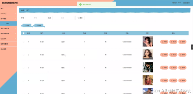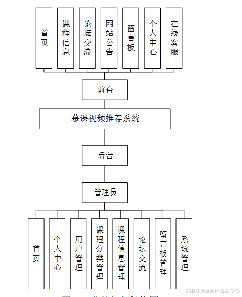 本课题要求实现优质的慕课视频推荐系统,就一定要包含有前台页面和后端数据库、服务器相联系,从而实现系统的功能运转。系统分为用户模块和管理员模块两部分,主要包括对个人中心、用户管理、课程分类管理、课程信息管理、论坛交流、留言板管理、系统管理等功能进行查询,新增,修改和删除等。