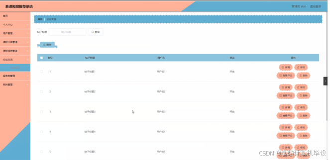 管理员点击论坛交流。在论坛交流页面输入帖子标题进行查询或删除论坛交流列表,并根据需要对论坛交流详情信息进行详情、修改、查看评论或删除操作;如图5-10所示: