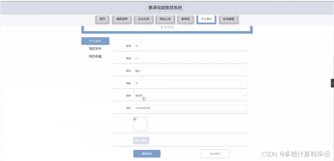 个人中心:在个人中心页面通过填写个人详细信息进行信息更新;并根据需要对我的发布、我的收藏进行相应操作;如图5-4所示: