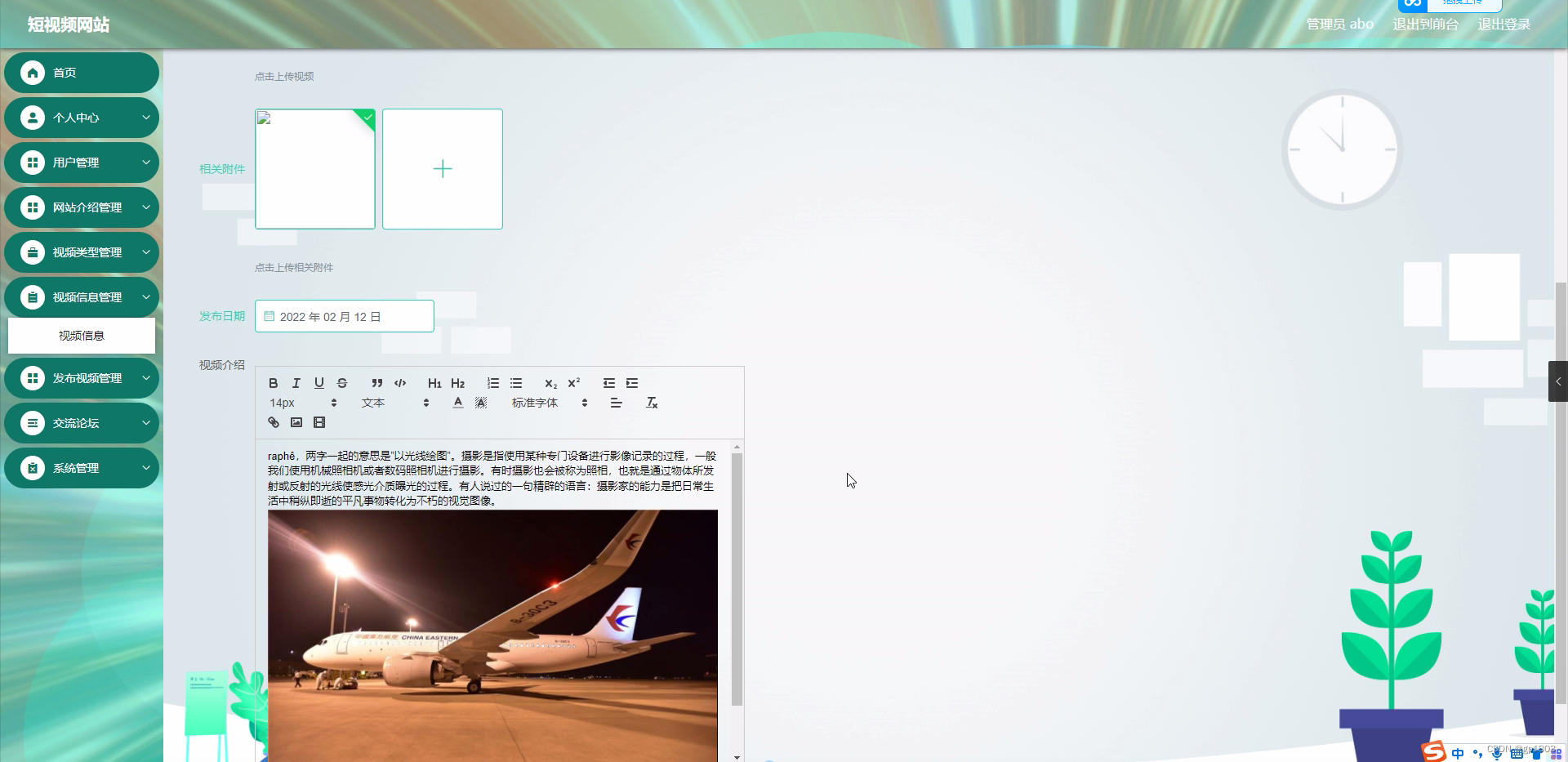 - 网站介绍:向用户介绍短视频网站的背景、特色和服务,包括网站的定位、宗旨等。