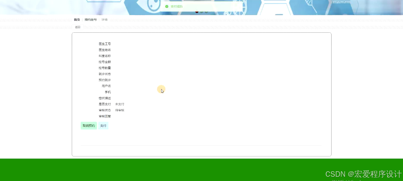 - 取消预约:提供预约取消功能,允许患者在规定时间内取消已预约的挂号,释放医疗资源,提高资源利用率。