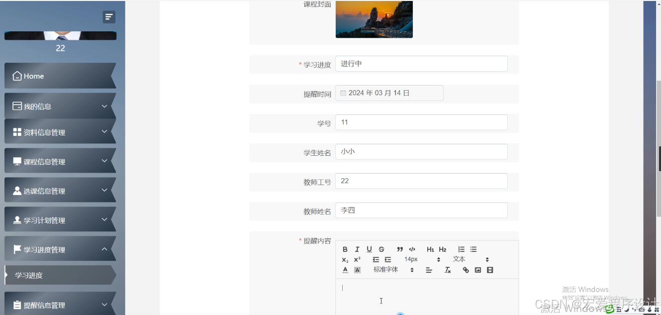 - 学生端:集成课程学习、案例模拟、进度管理与智能提醒功能。