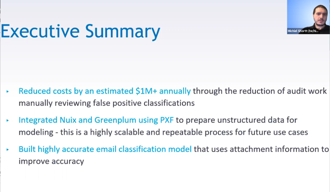 A42 Labs(https://www.a42labs.io/)是美国的一家人工智能和机器学习软件和服务公司,它使用Greenplum进行所有工作,从生成报表和BI到包括基于大数据集的分布式机器学习等复杂应用场景。A42 Labs的数据科学家Michiel Shortt在演讲中讲述了一个案例:金融服务客户希望标记电子邮件中的不合规行为,并进行的审核和审计工作。机器学习对合规性应用的好处之一是使追踪误报的繁琐工作自动化。