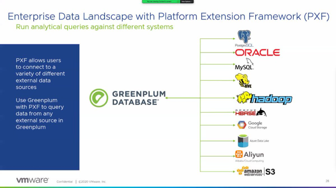 在Derek的演讲后的第二个主题更深入地讲解了联邦查询的奥秘。将数据加载到数据仓库(ETL)是一个众所周知的过程,然后使用批处理的方式可以很好的生成基础报表时。但是在《PXF:现代企业的查询联合引擎》主题演讲中,Ashuka Xue解释道,标准ETL对于快速查询和分析来自外部数据源的数据来说太慢了。而联邦查询可以让你更方便的获取多个位置的数据(数据湖,对象存储,SQL,NoSQL,私有云,公共云)。Greenplum为联邦查询专门构建了框架PXF。PXF使用数据源专用插件来并行访问各种数据源。