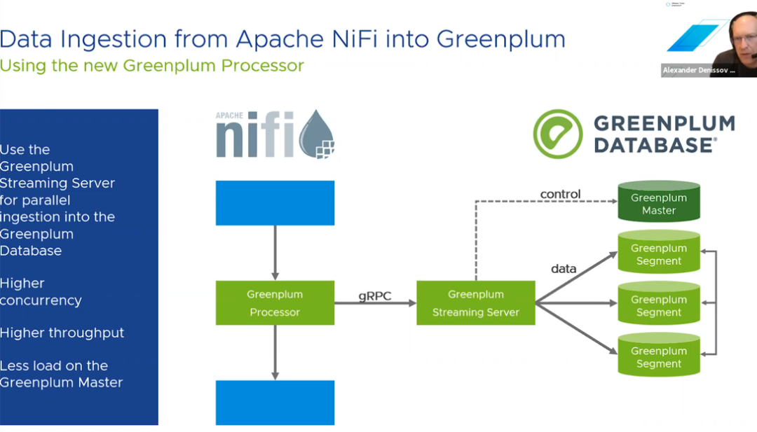 Apache NiFi是一种用于自动化企业系统之间的数据流动和数据分发的系统。通过NiFi从源到接收器的数据流的跟踪能力,用户通过参数配置合适的数据丢失率和数据传输延迟。Greenplum开发Greenplum-NiFI连接器与NiFi系统集成。在讲座中,Alexander Denissov向我们介绍了NiFi的体系结构(https://vmwarelearningzone.vmware.com/oltpublish/site/openlearn.do?dispatch=previewLesson&playlistId=7287e94f-d599-11ea-9f48-0cc47adeb5f8&id=49d14b9b-e7cb-11ea-9f48-0cc47adeb5f8),并向用户展示了如何提取数据并通过NiFi数据管道导入到Greenplum Processor中。