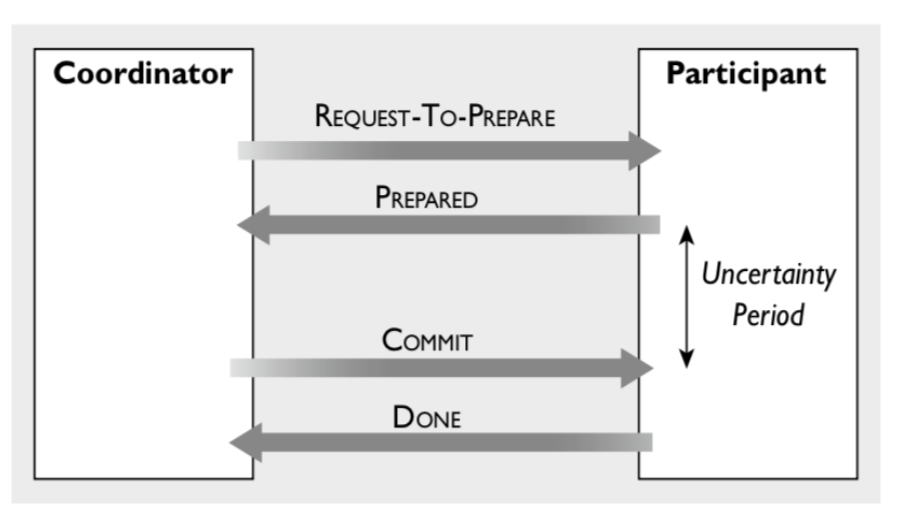 在一些2PC的实现里,第二阶段的最后,参与者向协调者发送确认消息。A收到所有参与者的确认消息后,把记录<complete T>加入日志文件中。
