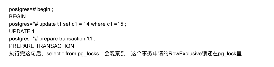 当执行prepare时候,PG会把该事务的lock信息当做prepare日志记录的一部分记录在日志文件(xlog)里。当数据库重新启动,会读这个日志文件(xlog)这条日志记录,把锁“还原”到pg_lock表里。