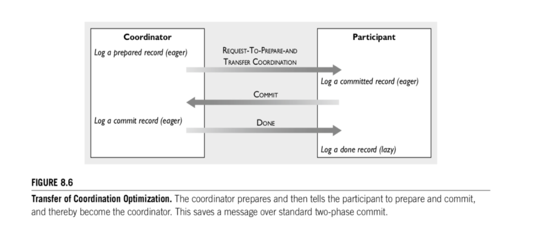 这种优化在Bernstein的著作里称为协调权的转移,是指协调者认为可以做这种一阶段提交时,把决定权交给参与者,由参与者决定是否提交。