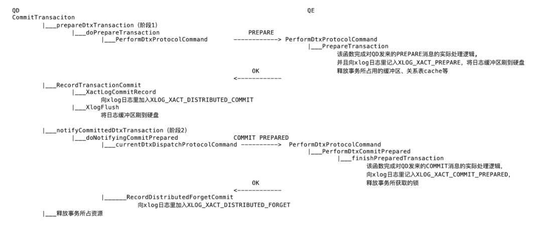 若满足这两个条件中的一个,QD就会调用函数doNotifyingOnePhaseCommit向参与者发送DTX_PROTOCOL_COMMAND_COMMIT_ONEPHASE命令,QE完成提交。