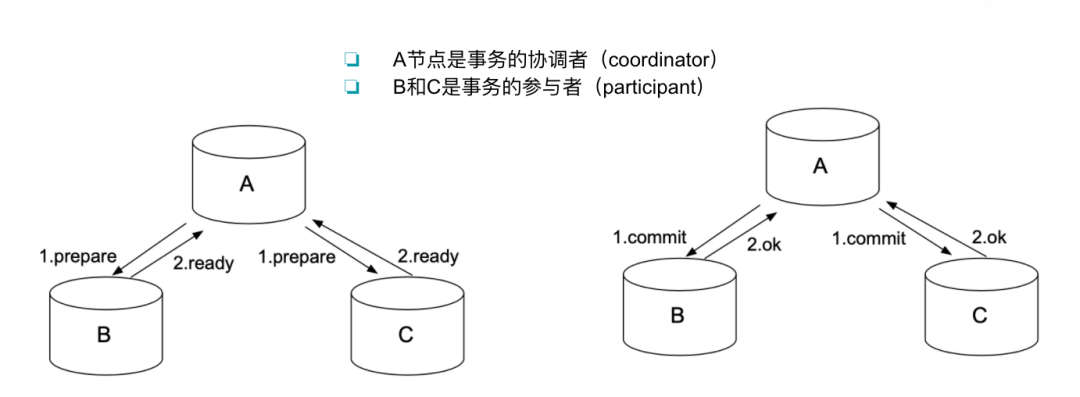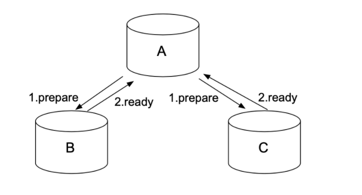 这个协议有两个角色,如图所示,A节点是事务的协调者,B和C是事务的参与者。事务的提交分成两个阶段,第一个阶段是投票阶段,也被称做prepare阶段;第二个阶段是决定阶段。在第一个阶段,假设有一个事务已经完成操作,决定提交。首先需要发一个prepare消息给B和C节点这两个参与者,B和C收到消息后,根据自己的实际情况,如果可以处理提交,就会回复一个ready,来告知已经准备好提交。当A节点收到B和C参与者所有的确认消息后,才会发送commit消息,让B和C进行提交。如果,有节点回复无法提交,则整个事务提交不能执行,A节点会发送abort命令给所有参与者。