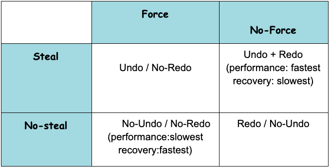 Force: 事务提交时,所修改的页面必须强制刷回到持久存储中