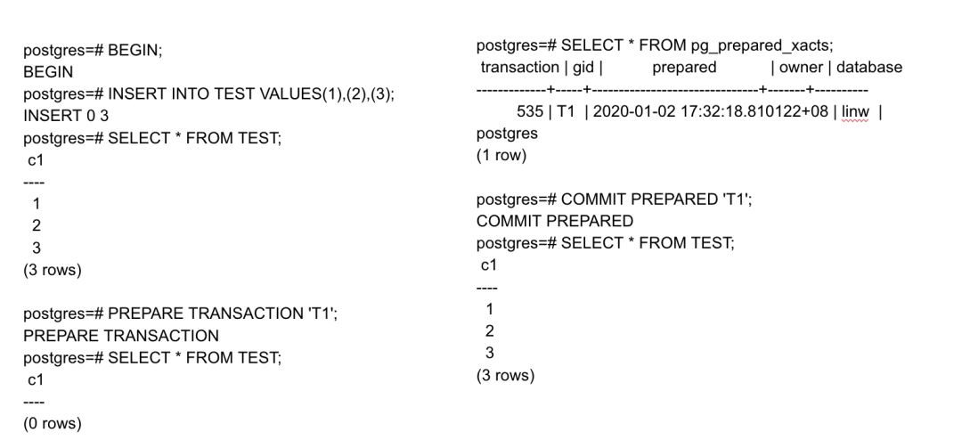 PostgreSQL主要通过PREPARE TRANSACTION相关SQL命令实现对两阶段提交协议的支持。然后通过PREPARE TRANSACTION、COMMIT PREPARED、ROLLBACK PREPARED命令实现了对两阶段提交协议参与者的支持。PREPARE TRANSACTION对应两阶段提交协议的第一个阶段,协调者向参与者发送PREPARE命令。COMMIT/ROLLBACK PREPARED命令对应第二阶段,协调者再收集到所有参与者的PREPARE响应消息后,向参与者发送COMMIT或者ROLLBACK命令。