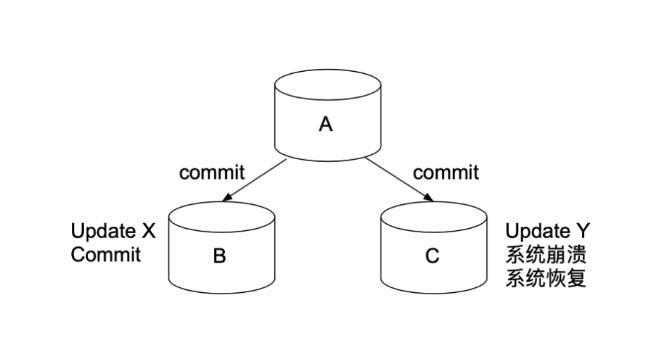 通过下图,我们可以看到,一阶段提交并不能保证分布式的原则性。用户通过A发起查询请求并提交,这个查询所涉及到的操作包括在B节点更新X,在C节点更新Y。设想这样一种情况,A向B、C发送提交请求,在B节点,更新数据X并提交成功,在C节点,更新数据Y,但是并没有将Y的修改写入稳定存储器,此时C节点数据库发生系统崩溃,系统需要进行恢复操作,该事务并没有提交成功,所以对数据Y的更新丢失了。这个分布式事务,B提交成功而C提交失败,使得数据库处于不一致状态,违背了事务的原子性。