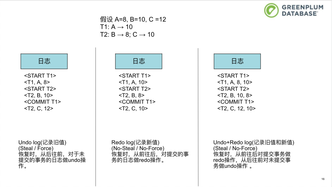 下图的日志中,左面这一栏是undo log,一开始有A、B、C三条数据,T1修改了A,T2修改了B和C。那么它的日志大概就是这样一个形式,记录数据对象的旧值。如果此时发生崩溃,恢复时是从后往前,对未提交的事务的日志做undo操作。这样就可以撤销那些未提交事务的修改,保证数据恢复到原来的值。