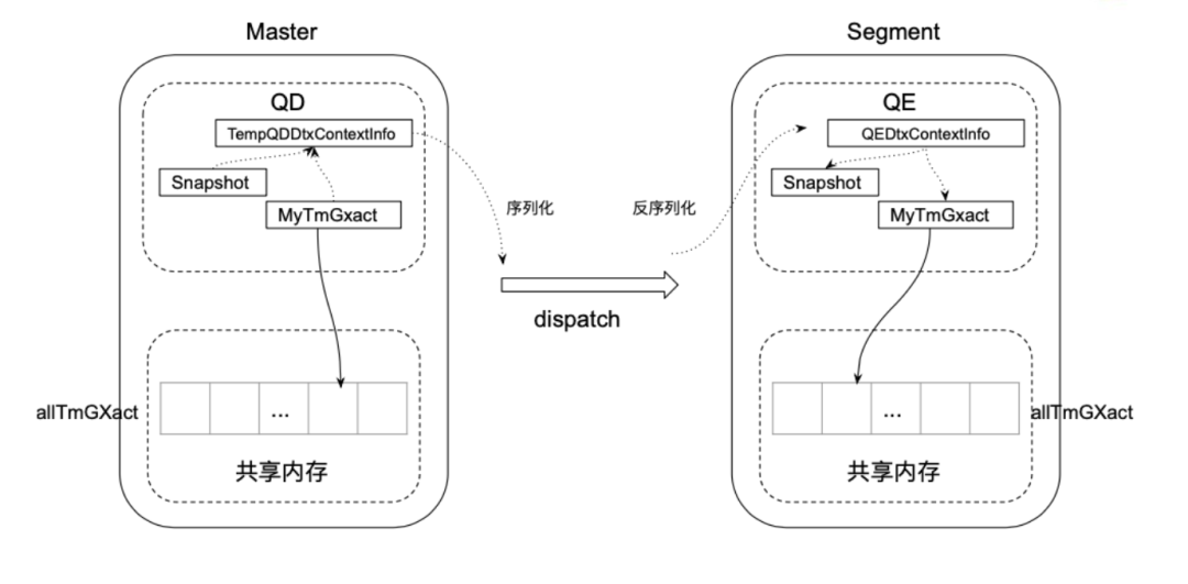 这些分布式事务信息,包括分布式快照信息,再通过这种序列化的方式,把它序列化到一个查询计划里,然后再用dispatch的方式发送到segment上。Segment节点作为分布式事务的参与者,需要把这些信息进行反序列化,读到自己的内存里,从而完成一个QD到QE之间的信息的共享。