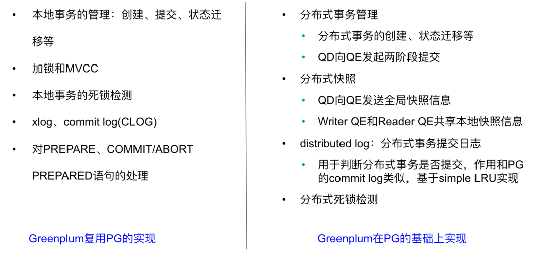 右边是Greenplum在这个基础上独立实现的功能,包括分布式事务的创建、状态迁移、QD向QE发起两阶段提交等,分布式死锁检测,全局分布式快照创建与同步。