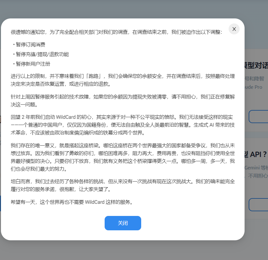 虚拟卡渠道的“集体退潮”: 为了翻越这堵墙,虚拟卡曾是许多人的救命稻草。但好景不长,以Wildcard野卡为代表的主流服务商,因合规问题相继暂停服务,让这条路也几乎被堵死。这让许多依赖于此进行GPT充值的用户陷入了困境。