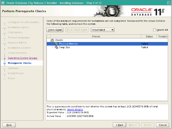 11gR2 的安装界面大变(便?变?随你理解吧),接下来就是点击下一步的工作了,中间过程不再过多描述。补充说明一下关于ORACLE安装检查的部分,如下所示: