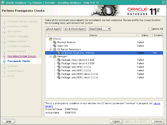 可以看到某个核心参数"shmmax"的期望值与实际值并不相符括弧其实是俺故意改错的,这里可以直接通过Fix按钮,让ORACLE自动进行修改,当然啦,软件包还是需要手动处理的。不过安装packages时并不需要退出安装界面,随时通过rpm命令对所需的package进行安装,完成后点击Check Again或Fix&Check Again按钮即可。 以上图为例,全面修正后点击Check Again,弹出界面如下: