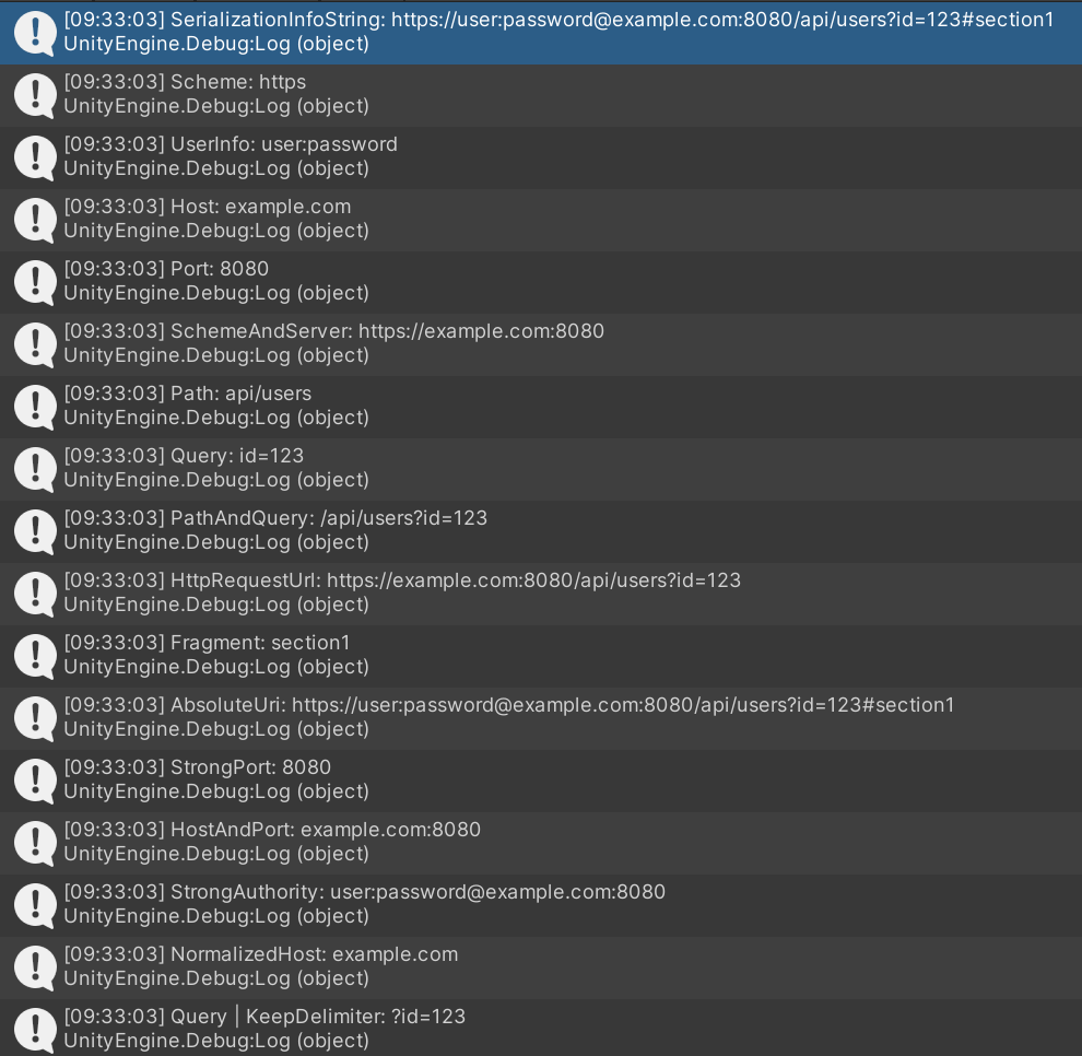 Debug.Log($"AbsoluteUri: {absoluteUri}");