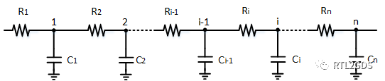 对于单输入单输出的net,假设不考虑net之间的耦合电容(即不考虑噪声的影响),并且也不存在电阻性的反馈回路的情况,可以用Elmore Delay模型来计算Net Delay,如下图: