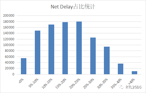 你可能好奇Net Delay所占的比重如何?这个跟工艺和设计是相关的,但是总体上的趋势是,随着工艺尺寸缩小,Net Delay占比越来越高。下面是Net Delay占比的分布图,统计对象是基于12nm工艺的一个SoC设计中的100万条路径。可以看出,很大一部分的Path中的Net Delay占比超过20%。