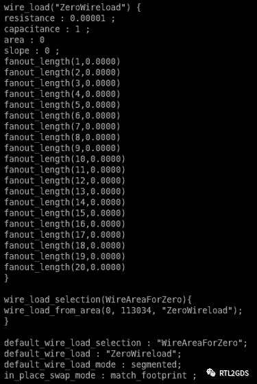 下图是标准单元库.lib中定义的一种Wire Load Model,名字是“ZeroWireload”,它是根据net的扇出(fanout)来预估长度(length),然后再根据所定义的单位长度的电阻(0.00001),以及单位长度电容(1)来计算net的寄生RC参数。不过图中的例子比较理想化,都是设成了0,完全不考虑net delay。在实际项目中,必要时,可以自己定义Wire Load Model,尽量在综合阶段将Net Delay的影响考虑进去。更细节的关于Wire Load Model的使用可以在公众号(RTL2GDS)中回复“WLM”了解更多内容。