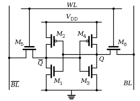 由M1 – M4组成的两个反相器继续保持其状态,只要保持与高、低电平的连接。