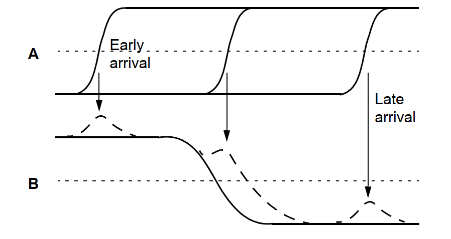 如图,在crosstalk分析中,当信号A和信号B跳变发生于同一时刻,那么信号B会因为信号A的影响,产生一个delta delay。而如果信号A的跳变过早或者过晚,那么对于信号B的delay就没有影响。