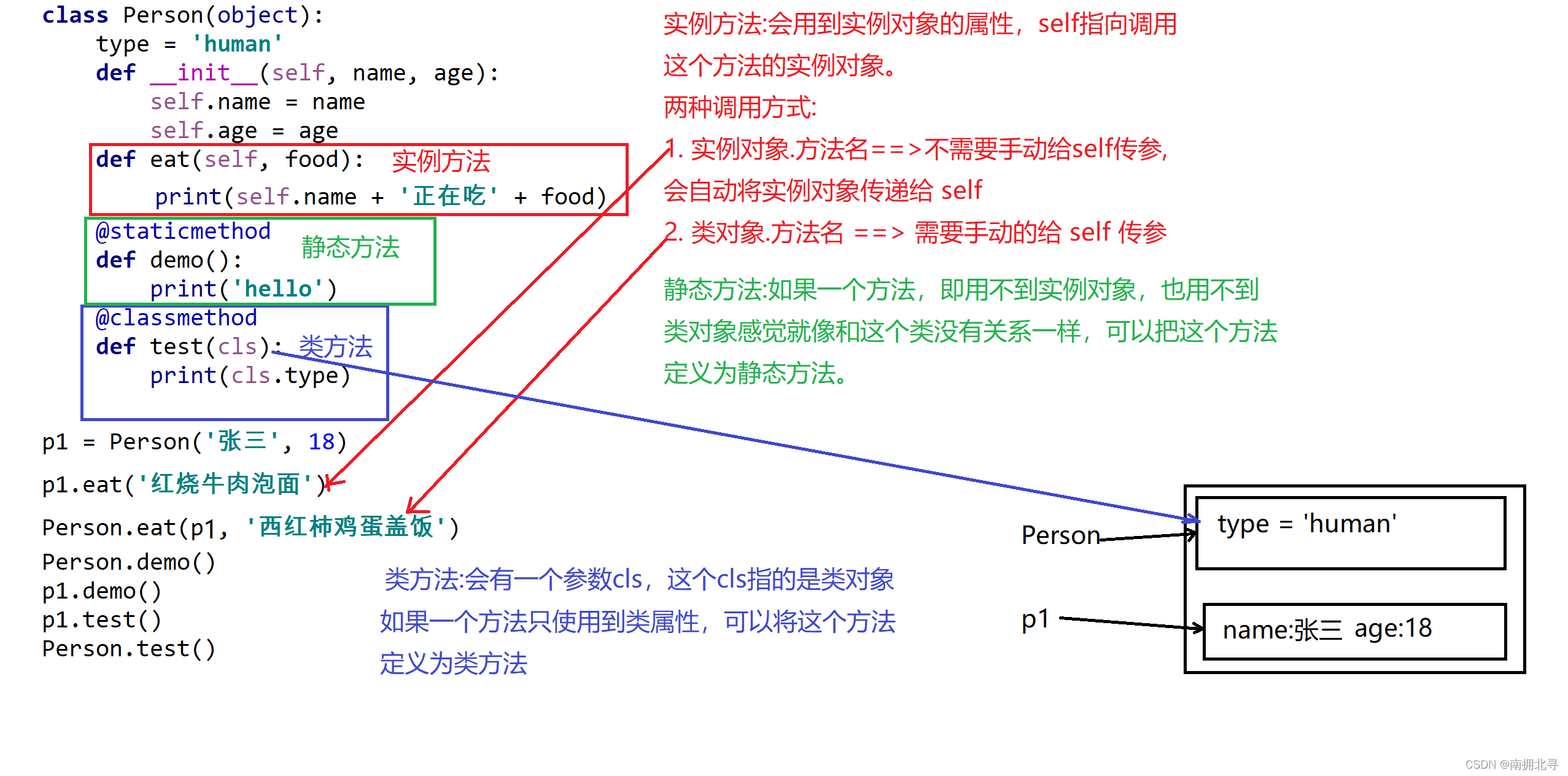 def eat(self, food): # 对象方法有一个参数self,指的是实例对象