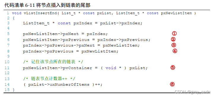 新的节点的插入,影响到的是链表中最后一个元素的后继以及当前被插入元素的前驱、后继以及归属属性。具体的操作效果为:新的节点更新自己的前驱和后继,而对等的关联信息则是当前pxIndex所指向的前驱和链表的尾结点。而链表的尾结点在初始化的时候,pxIndex存储的其实是指向链表尾结点Item的指针。因此,这里的这个赋值更新,其实是实现了让这个新的节点指向了链表的尾节点。