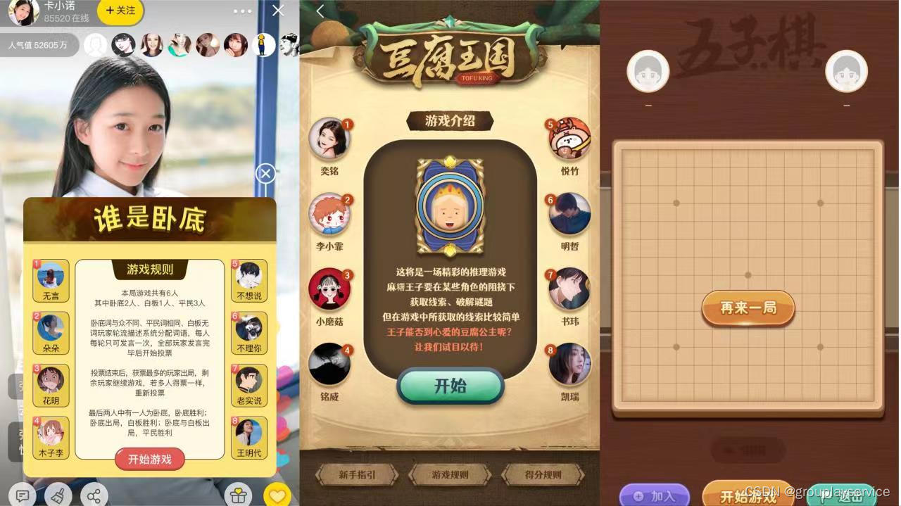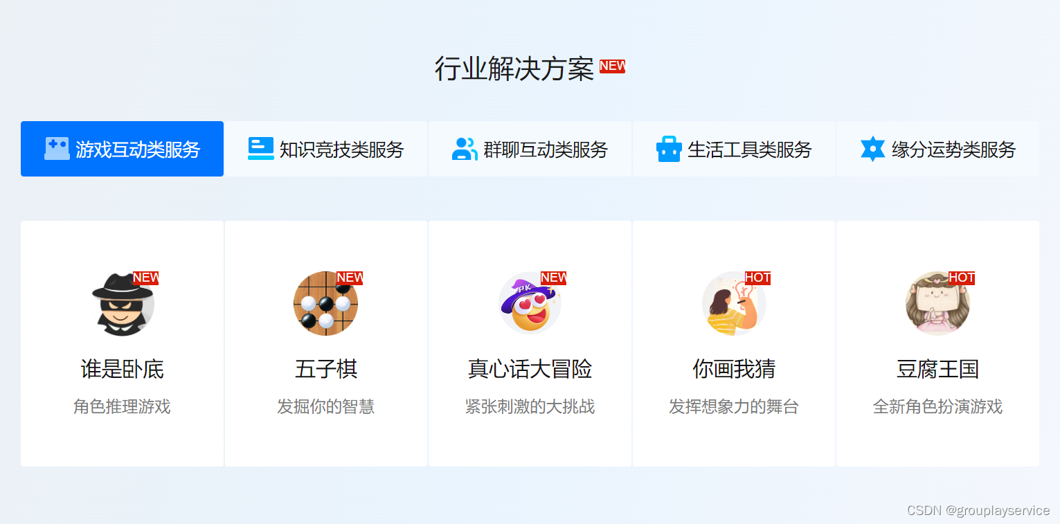 群玩正是为了减少app功能同质化,推出第三方互动内容服务,为产品接入游戏、娱乐内容,以达到用户促活和转化的目的,同时又能提高用户满意度。一些社交游戏如:你画我猜、谁是卧底、豆腐王国等,社交+推理玩法,是玩家喜爱的烧脑益智类游戏,支持自定义场景,让产品富有个性化、内容更有趣!