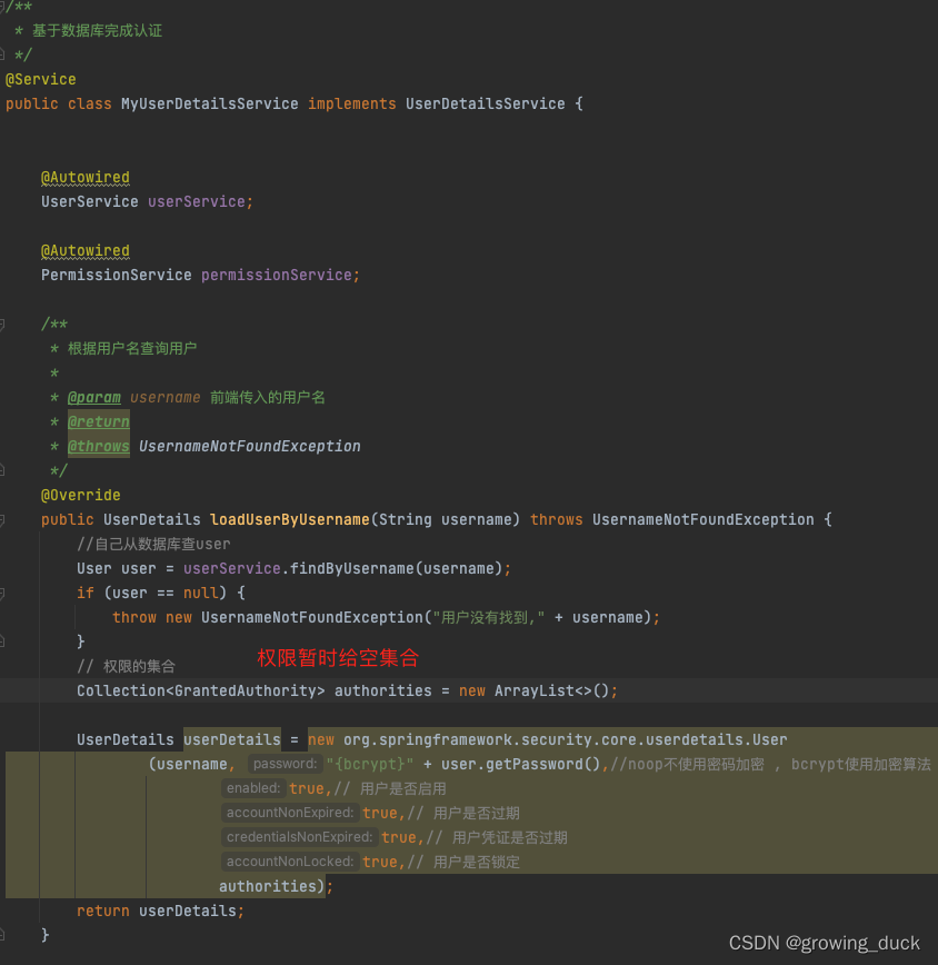 最后需要在用户登录认证的方法loadUserByUsername(String username)中,给用户添加相关的权限。