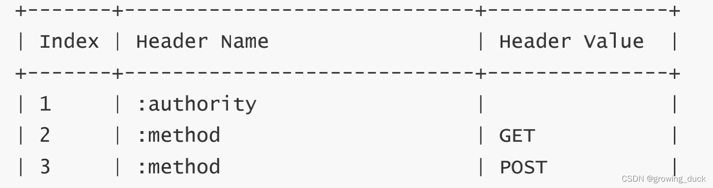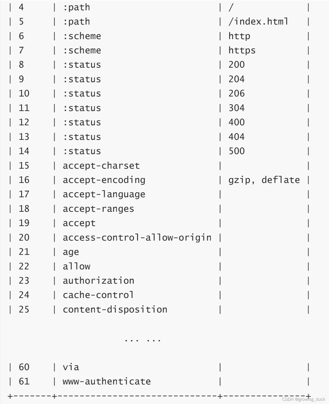 - 静态表: header中预定义好 不可更改的通用名称和value,有61个