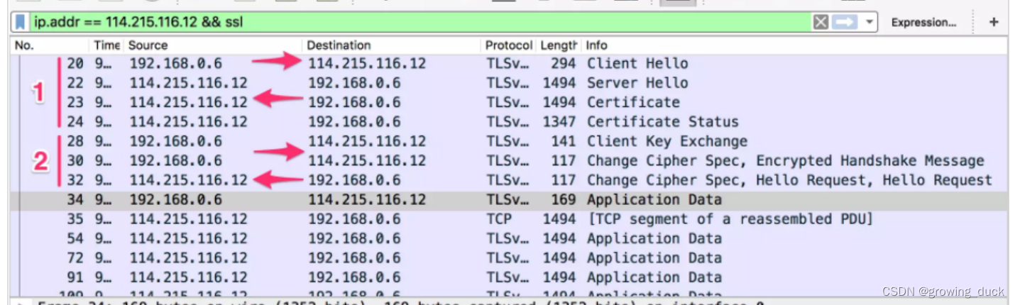 常规情况下,TSL握手协议会经过两个RTT,双方发送随机数和服务端发送证书,已经客户端发送加密列表等服务端确认加密方式。用抓包工具可以看到发送业务数据Application Data前经过了两个RTT