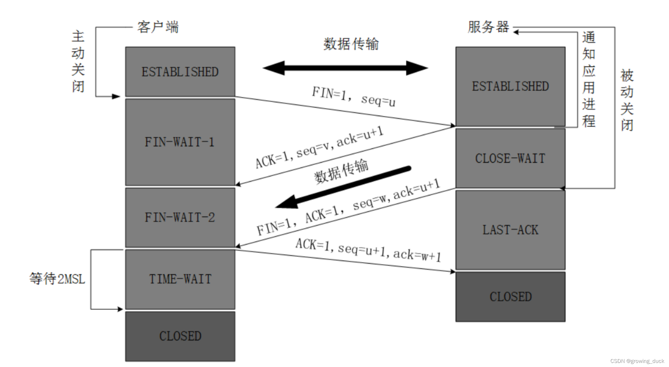 数据传输完毕后,双方都可释放连接。最开始的时候,客户端和服务器都是处于established(表示连接已经建立)状态,然后客户端主动关闭,服务器被动关闭。