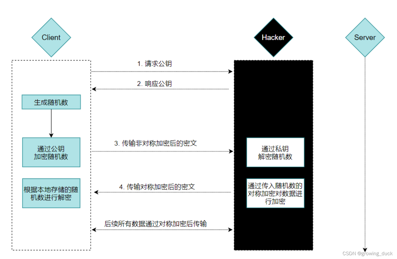 此时还有问题,假如客户端请求一开始就被黑客拦截了, 也就是说一直请求的是个假Server,它自己不知道,那还是有问题!如下图: