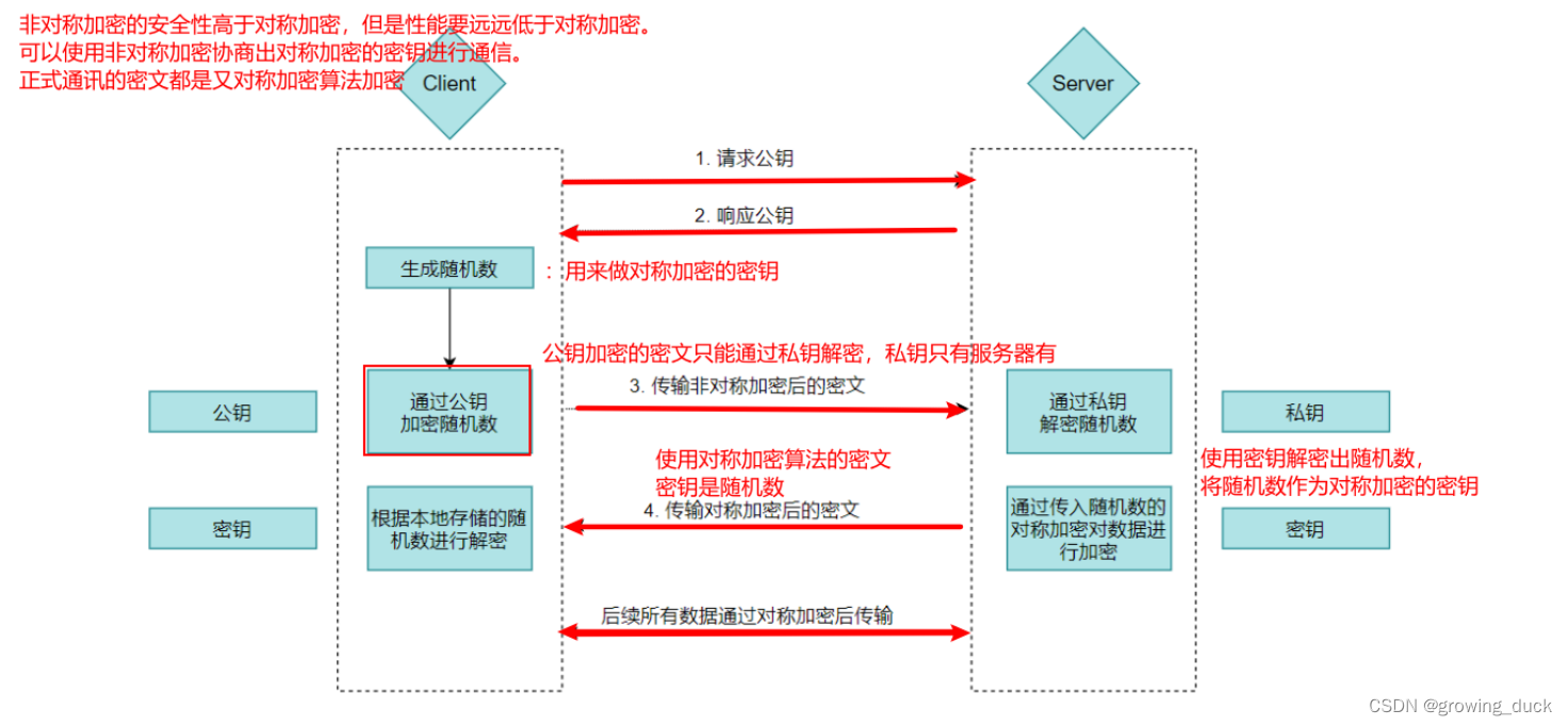 - 如果证书合法,就能拿到服务器的CA证书的内容,也就是可以拿到服务端的公钥了(这样,公钥一定是安全的,服务器也一定是合法的)。 接下来,双方就可以按照上面介绍的,通过非对称加密和对称加密传输业务数据。