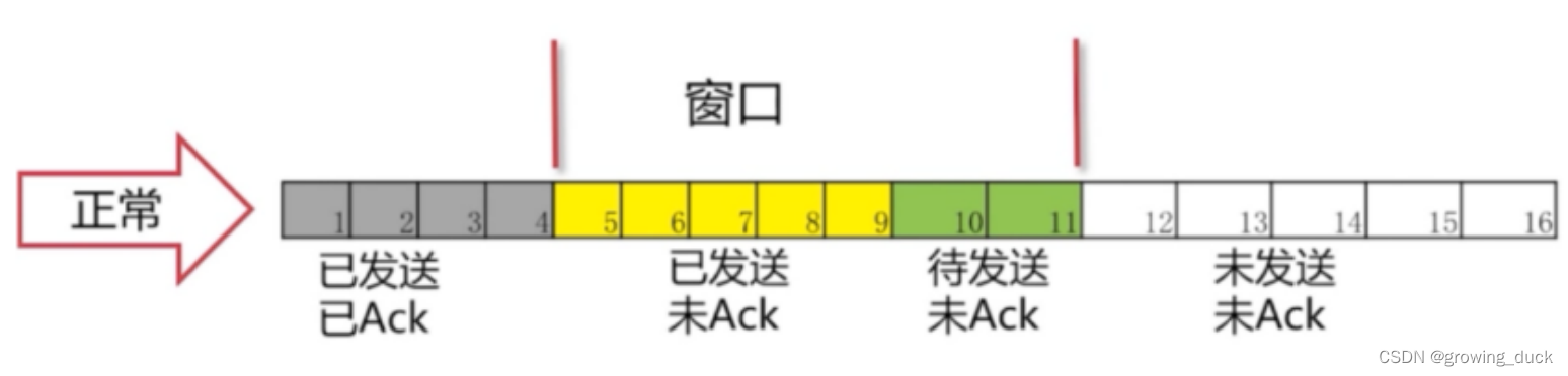 滑动窗口管理的就是中间两部分数据。 比如,当5被确认后,窗口就会右移一格,5变成灰色,将10发出去变成黄色,12加入内存准备发送,变成绿色。(当然,并不一定只处理一段)