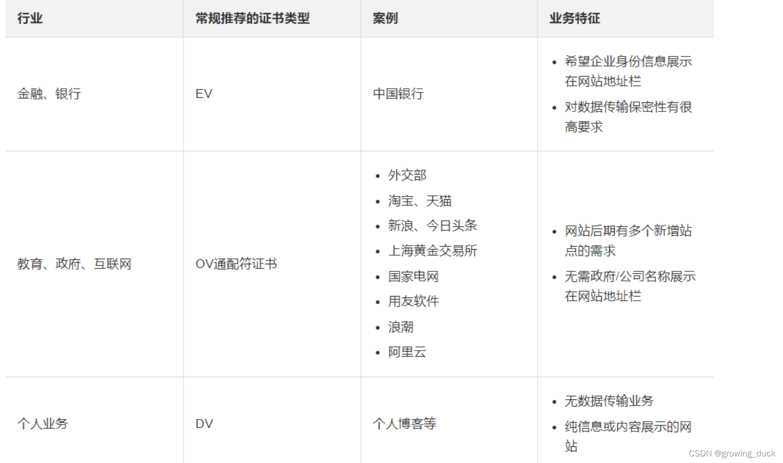 DV (域名型 SSL ):个人站点OV (企业型 SSL ):企业官网EV (增强型 SSL ):对安全需求更强的企业官网、电商、互联网金融网站![]()