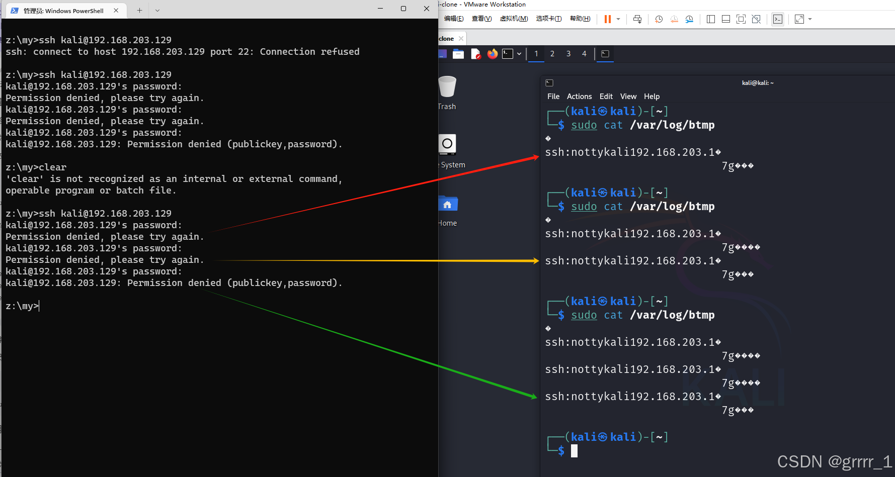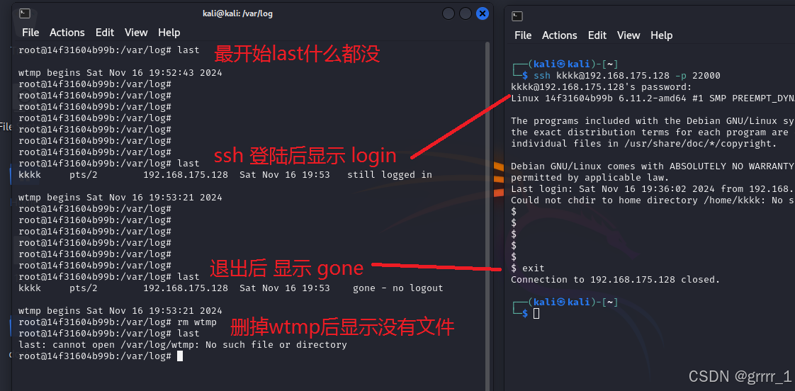 我们做个小实验,用ssh连接 Kali Linux 且故意输错密码,在btmp中留下记录,另外直接在kali终端内新建个用户,用 su 切换用户,故意输错密码,也在btmp中留下记录: