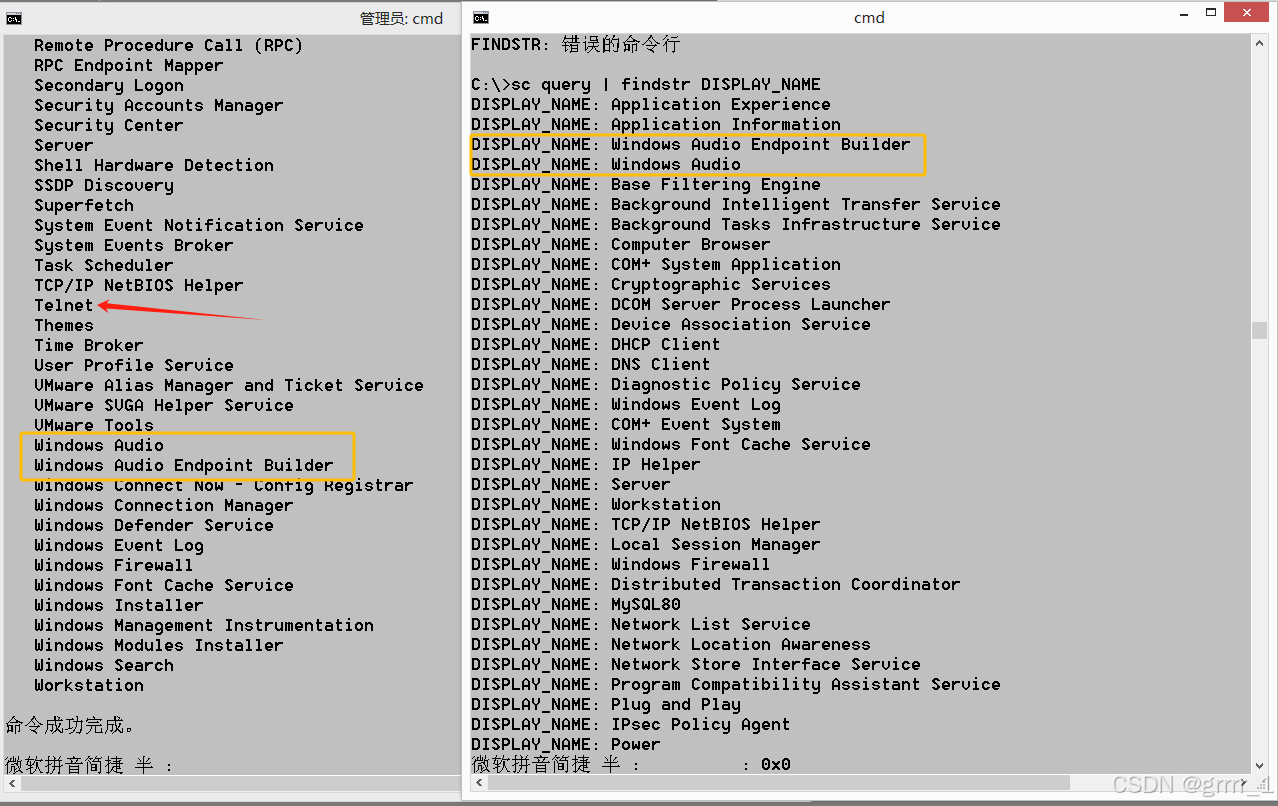 关于 net start 命令显示已启动服务列表,该条命令显示的是 display_name ,我们可以同步用 sc query 命令并过滤出 display_name 后对比下,net start 是按 display_name 排序,sc query 默认是按 service_name 排序,所以顺序上两者有些差异,但实际结果是一样的,右图的:Windows Audio Endpoint Builder 和 Windows Audio 服务,我们可以在下下图看到。