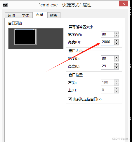 CMD 窗口左上角图标右键或右键选属性,点布局调整缓冲区高度,请根据自己windows系统服务的数量,自行测试下需要缓冲区高度大概是多少,一般一个服务输出的结果约9-10行。