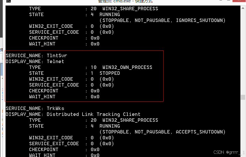 我们可以用 sc query tlntsvr 来查看 telnet 服务