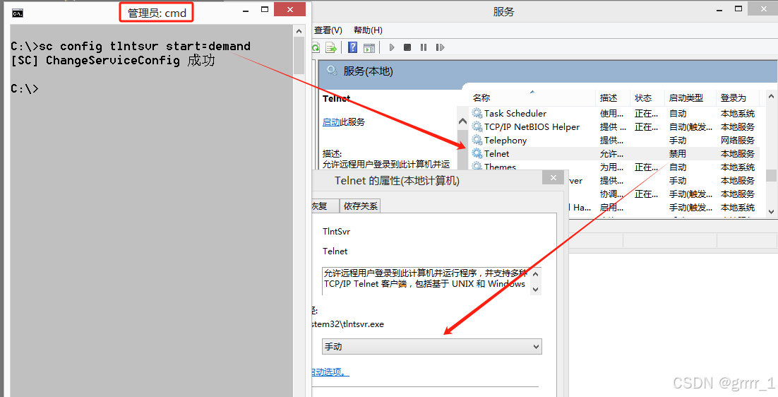 C:\>sc config tlntsvr start=demand # 管理员情况下